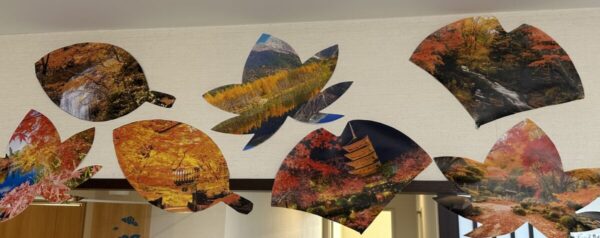 ラ・デュース恵み野の5階フロアで秋の装飾をして います。恵庭渓谷の紅葉や日本の紅葉の名所を紅葉や イチョウの形に切り取り飾っています。 今は冬やクリスマスの装飾を作っています。 寒い冬がやってきますが元気に過ごしていきましょう!
